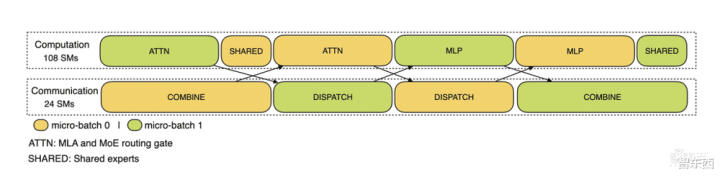 2、计算-通信重叠多机多卡的专家并行会引入比较大的通信开销,所以使用了双batch重叠来掩盖通信开销,提高整体吞吐。对于prefill阶段,两个batch的计算和通信交错进行,一个batch在进行计算的时候可以去掩盖另一个batch的通信开销。