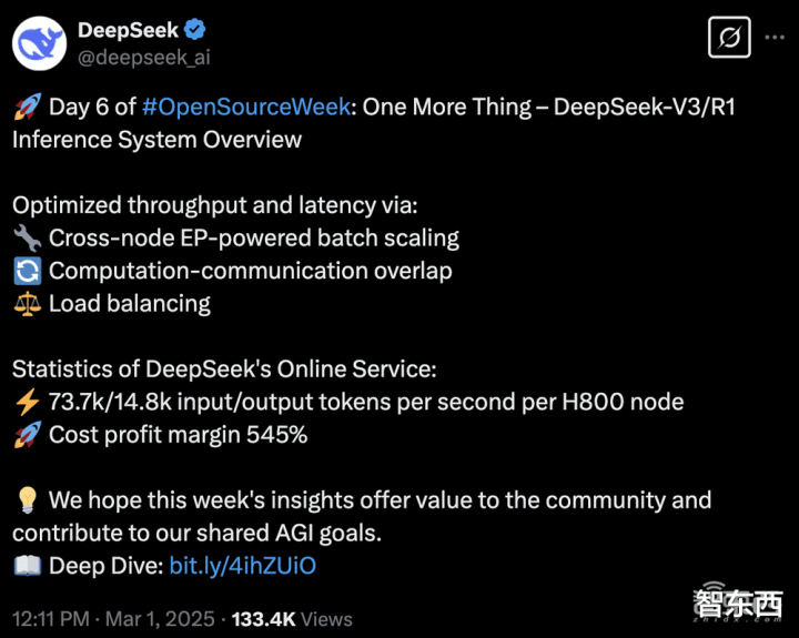 智东西3月1日消息,DeepSeek的开源周竟然还有彩蛋!开源第六天,DeepSeek不仅放出了DeepSeek-V3/R1推理系统技术秘籍,还公开了每日成本和理论收入!