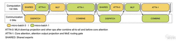 对于decode阶段,不同阶段的执行时间有所差别,所以DeepSeek把attention部分拆成了两个stage,共计5个stage的流水线来实现计算和通信的重叠。